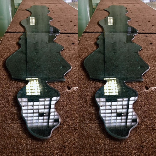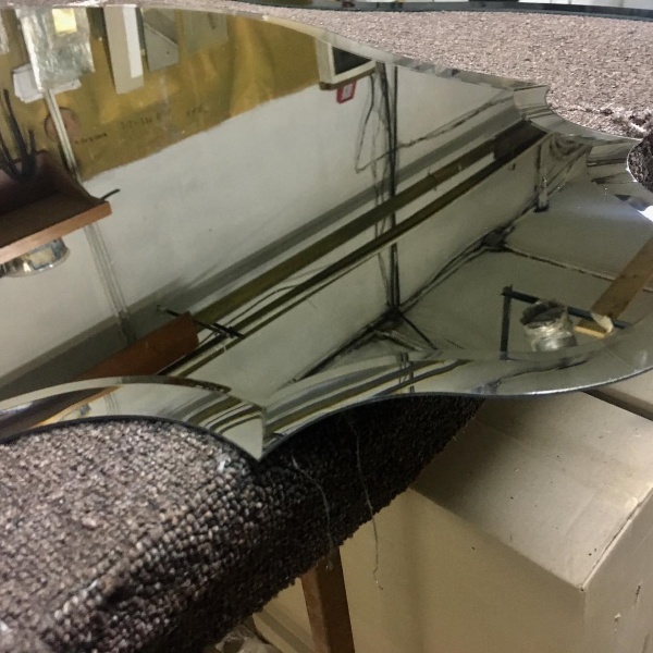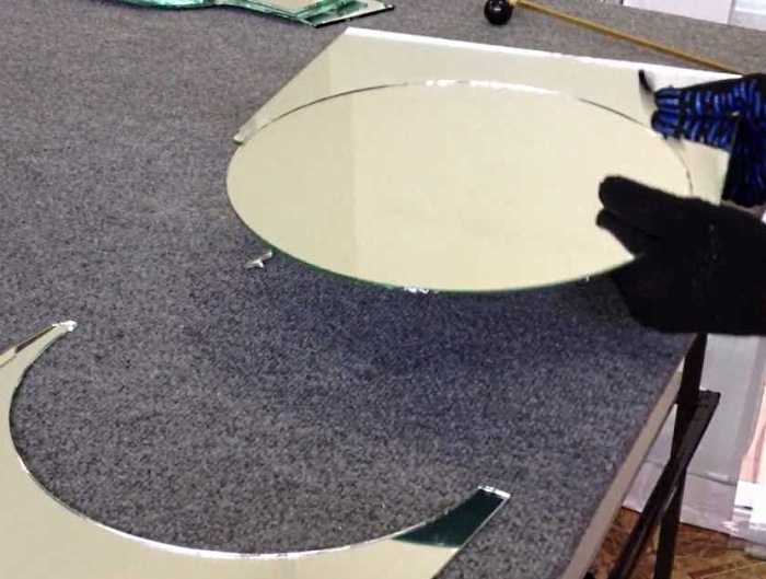 Выполняется либо по заранее изготовленному шаблону, если процесс осуществляется вручную, либо по подготовленным параметрам раскроя, в случае использования станка с компьютерным управлением. Процесс данной резки представляет значительную сложность, если необходимо изготовить зеркало уникальной формы.